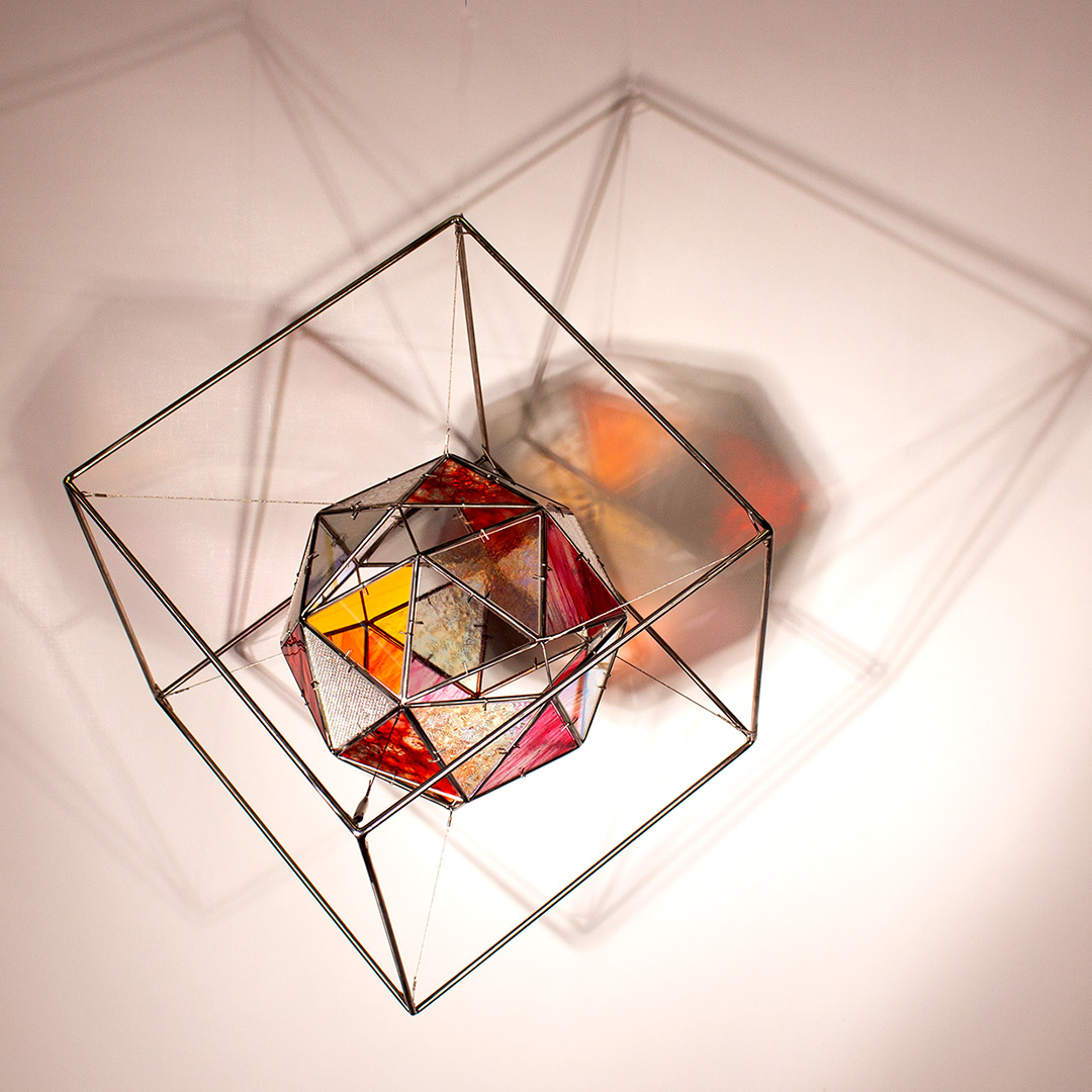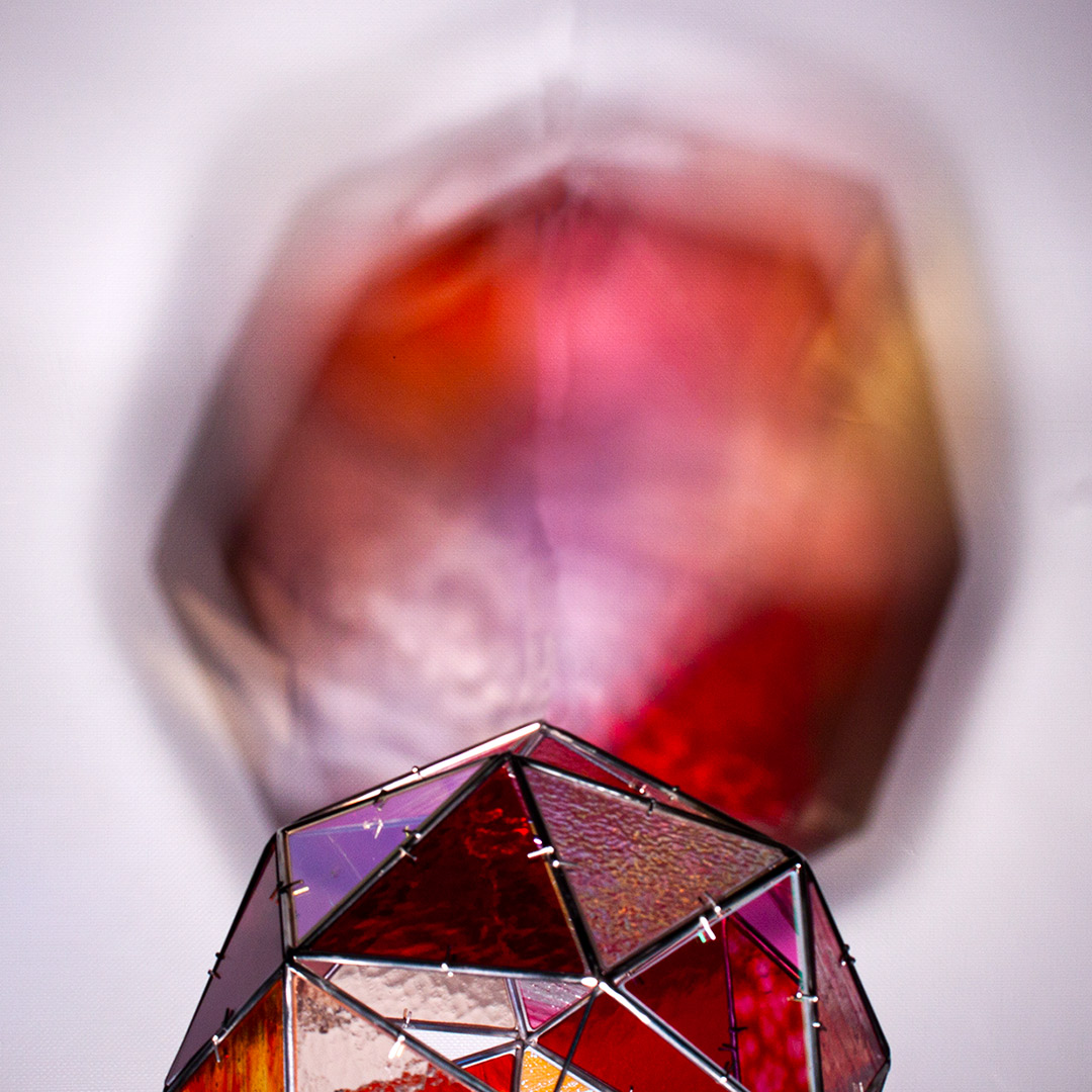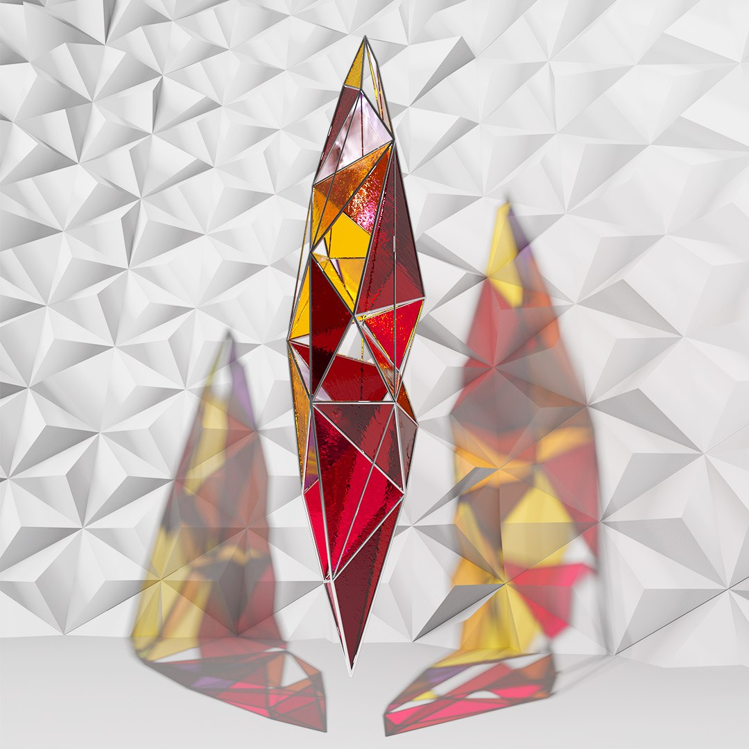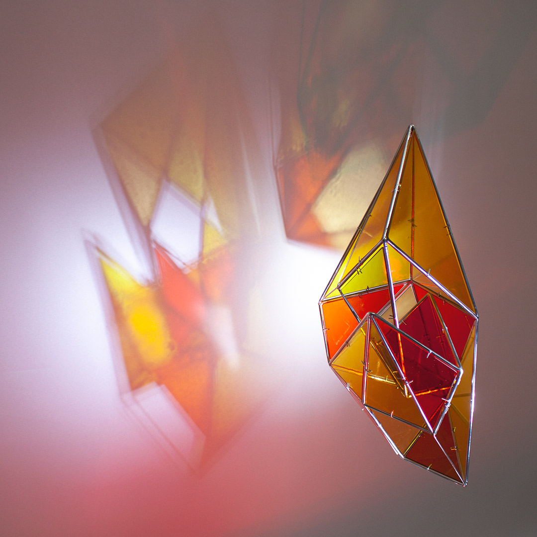 SELF aborda el entorno visual que genera una escultura translúcida, una vez iluminada, que tiñe el aire, después capturado. Su proyección crea una nueva entidad más compleja, que transciende de forma paralela a la silueta, forma y color de la figura, construida con acero inoxidable en la que se encastran vidrios coloreados tipo catedral.