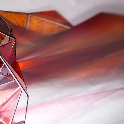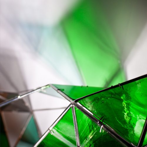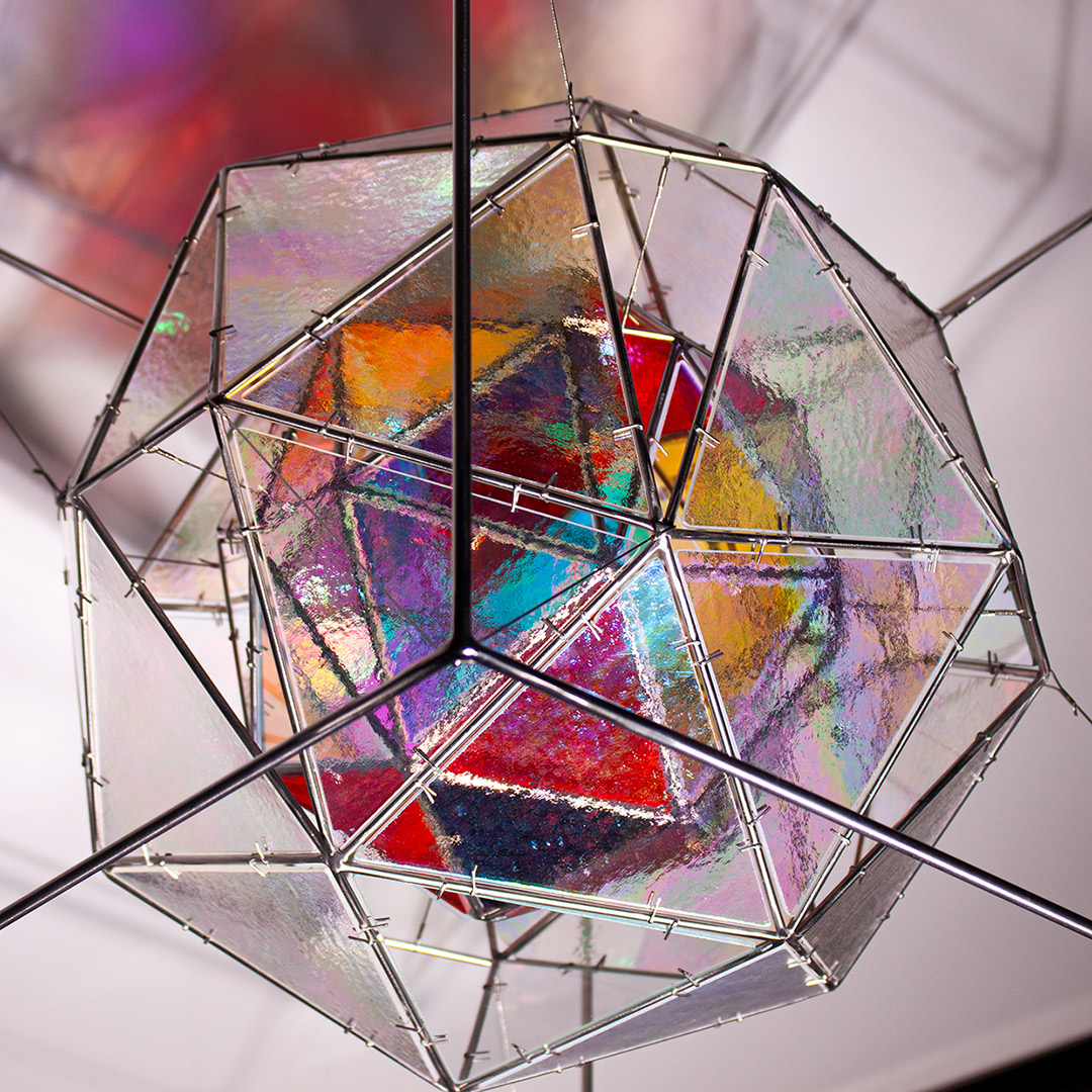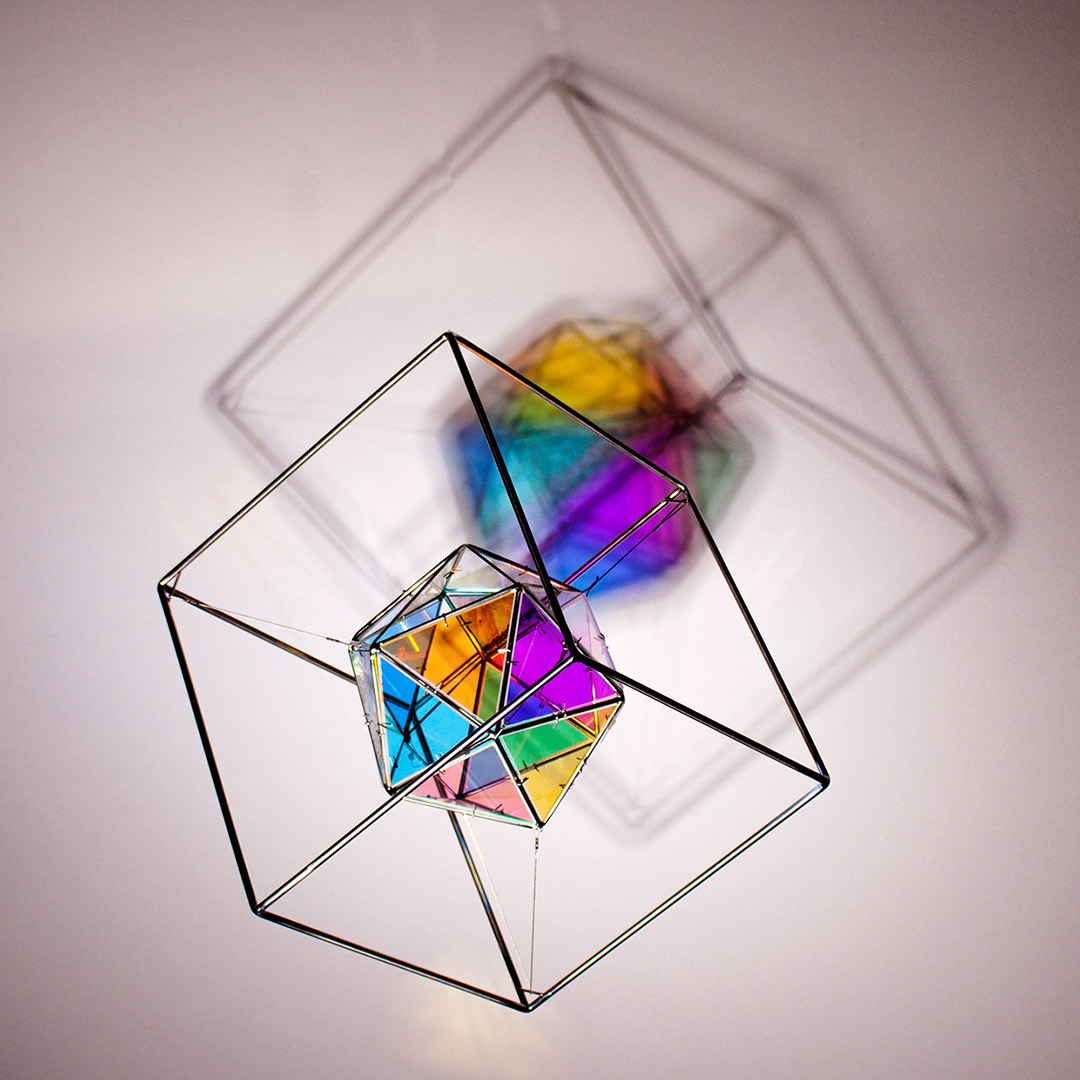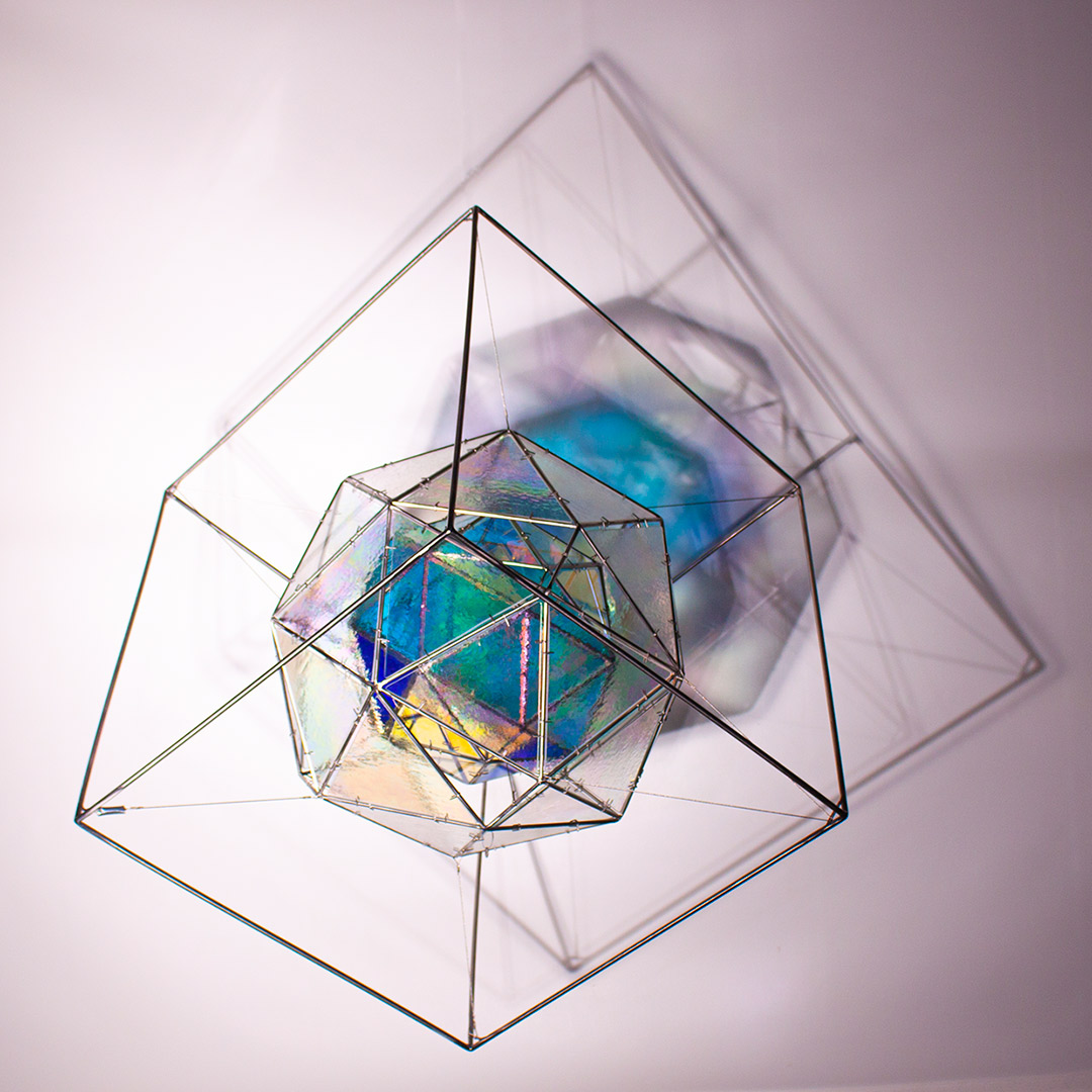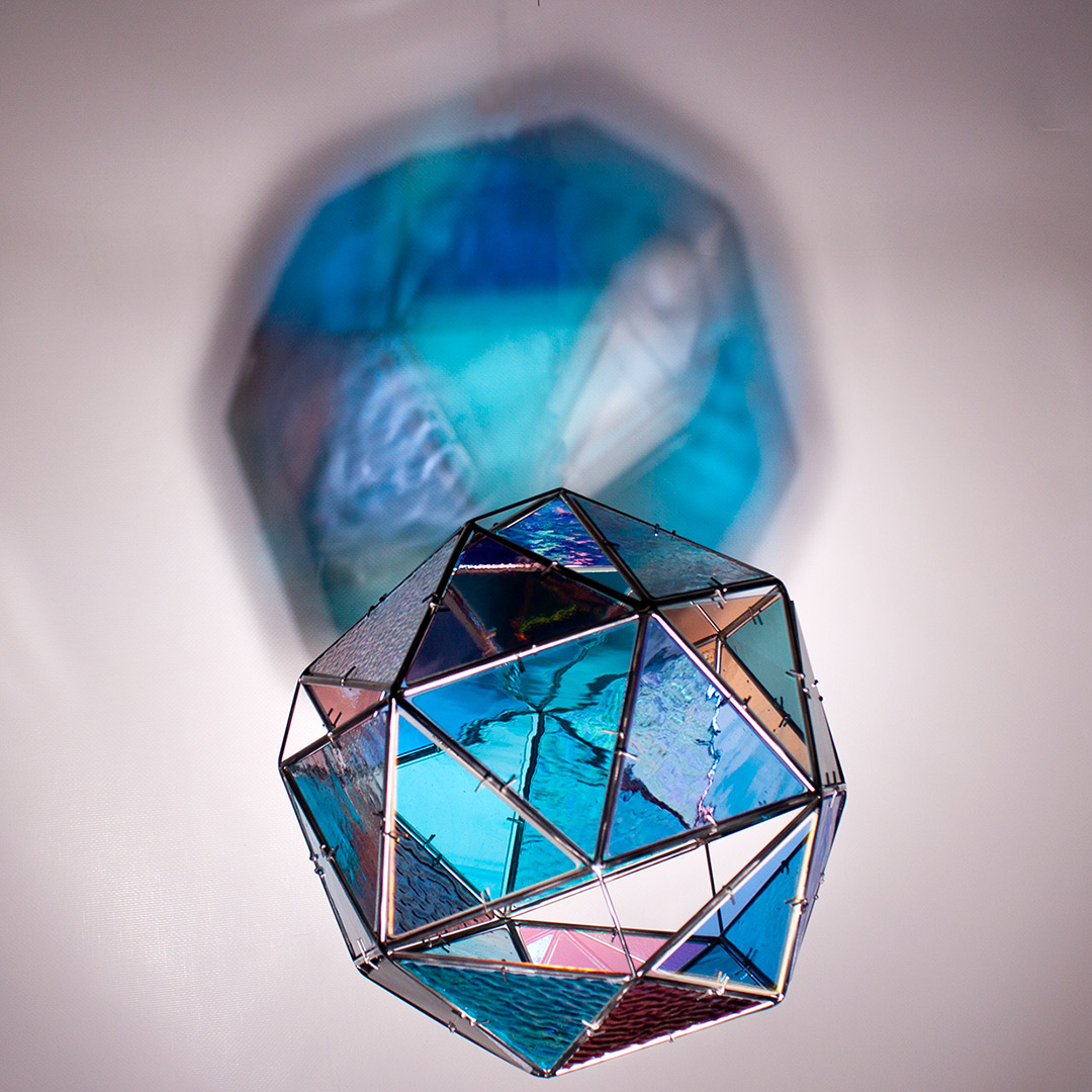 SELF aborda el entorno visual que genera una escultura translúcida, una vez iluminada, que tiñe el aire, después capturado. Su proyección crea una nueva entidad más compleja, que transciende de forma paralela a la silueta, forma y color de la figura, construida con acero inoxidable en la que se encastran vidrios coloreados tipo catedral.